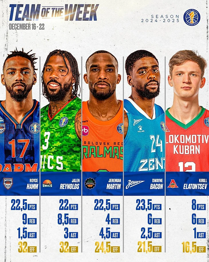 Елатонцев, Хэмм, Рейнольдс, Мартин и Бэйкон – в символической пятерке недели Лиги ВТБ