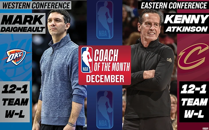 По итогам месяца это звание досталось Марку Дэйгнолту из «Оклахомы» на Западе и Кенни Эткинсону из «Кливленда» на Востоке.