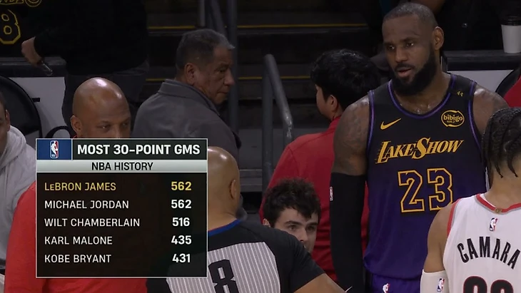 Леброн Джеймс сравнялся с Майклом Джорданом по количеству матчей с 30 очками и более (562) после победы над «Портлендом»