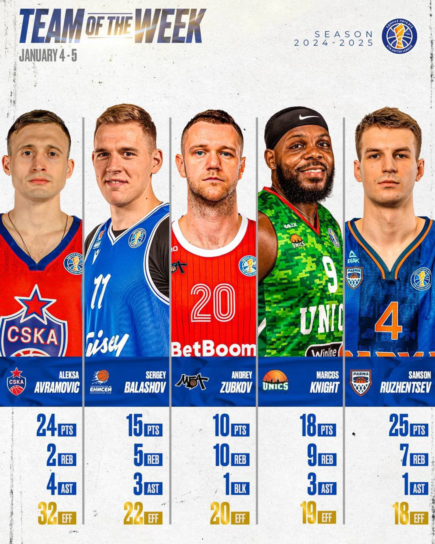В пятерку лучших по итогам матчей 4-5 января вошли Алекса Аврамович (ЦСКА), Сергей Балашов («Енисей»), Андрей Зубков (МБА-МАИ), Маркос Найт (УНИКС) и Самсон Руженцев («Парма»).