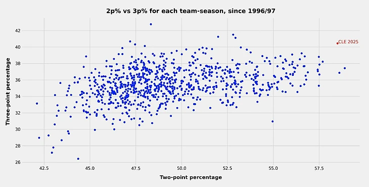 С сезона-96/97 лишь несколько команд превосходили нынешний «Кливленд» по проценту реализации 2-очковых и 3-очковых