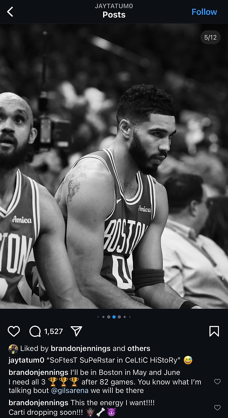 Тейтум отреагировал на слова Дженнингса, опубликовав свои фотографии и видео с саркастической подписью «Самая слабохарактерная суперзвезда в истории «Селтикс».