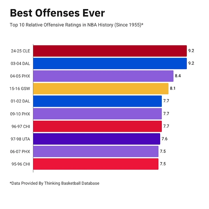 В сезоне-2024/25 команда имеет лучший в истории НБА относительный атакующий рейтинг. Этот показатель сравнивает нападение со статистикой других команд в лиге и позволяет оценить выступление с учетом разницы баскетбольных периодов.