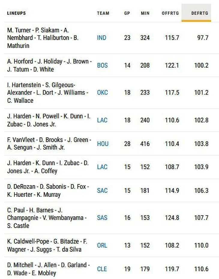 В Топ-3 также находятся пятерки «Бостона» (Хорфорд, Холидэй, Браун, Тейтум, Уайт) и «Оклахомы» (Хартенштайн, Гилджес-Александер, Дорт, Уильямс, Уоллес)