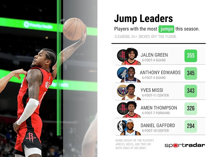 Первое место по этому показателю занимает защитник «Хьюстона» Джейлен Грин (355 прыжков). Далее идут Энтони Эдвардс (345), Ив Мисси (343), Амен Томпсон (326) и Дэниэл Гэффорд (294).