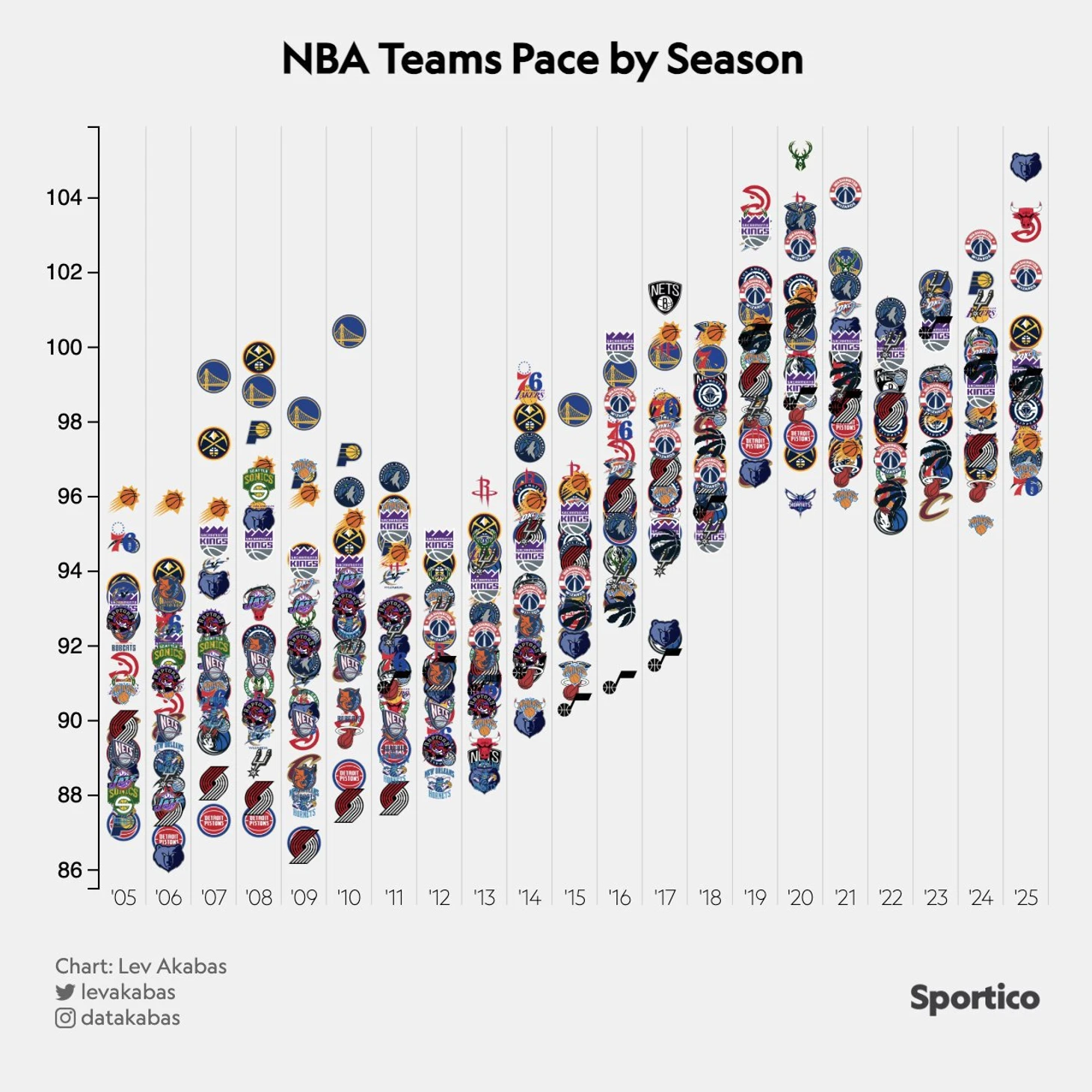 «Мемфис» в нынешнем сезоне уступает по скорости только «Милуоки» образца 2020 года. Также примечательно, что «Финикс» середины 2000-х годов сегодня был бы самой медленной командой в лиге.