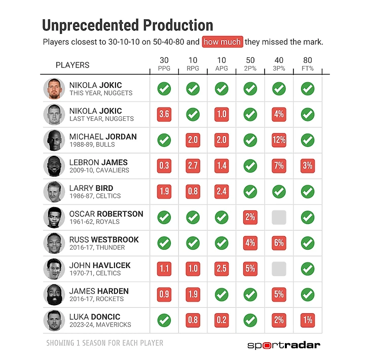 Никола Йокич может стать первым в истории в НБА, кто набирал 30+10+10 при 50% с игры, 40% из-за дуги и 80% с линии