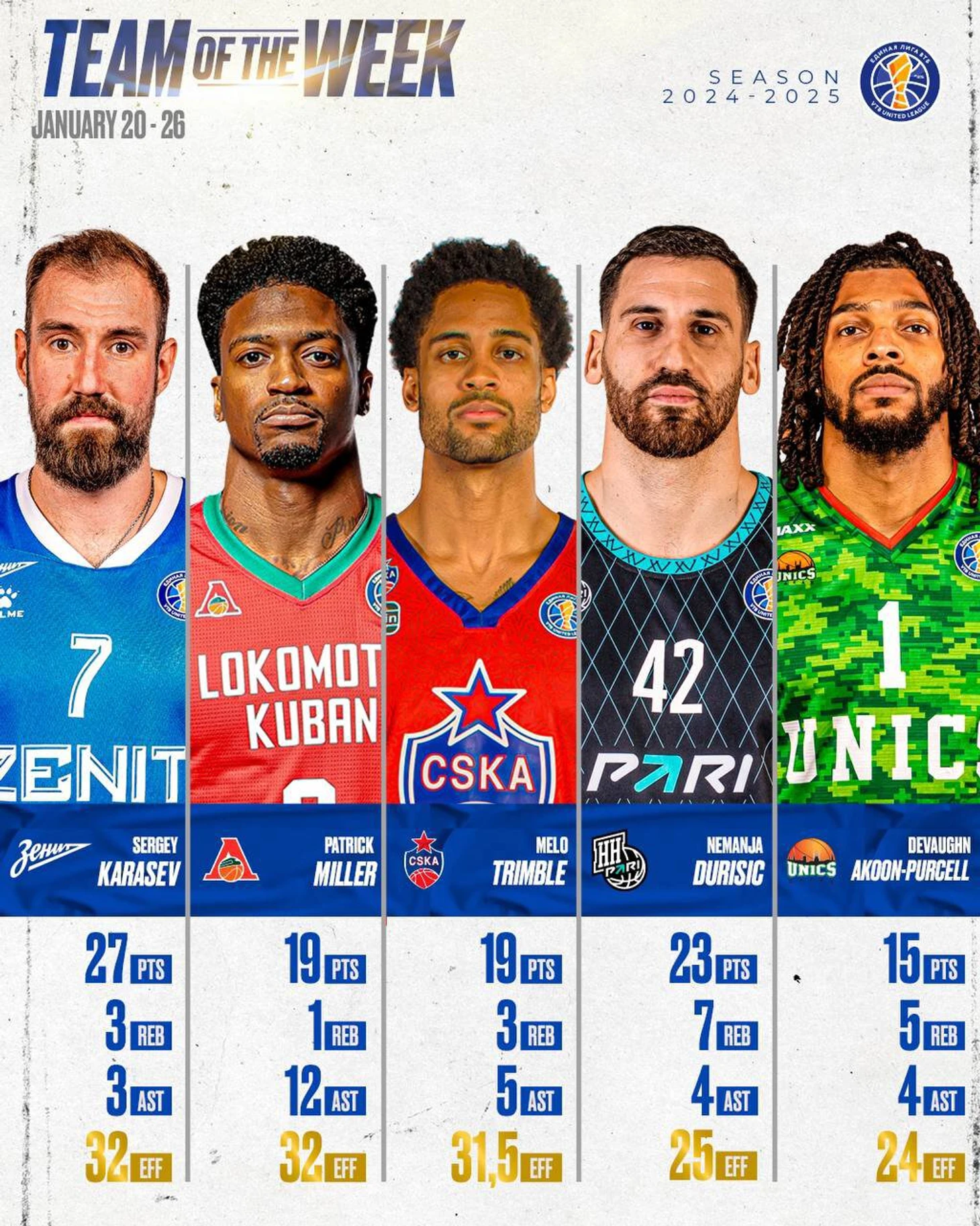 Карасев, Миллер, Тримбл, Джуришич и Акун-Перселл – в символической пятерке недели Лиги ВТБ