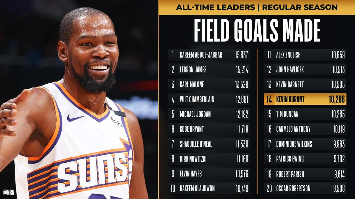 Теперь Дюрэнт попытается настичь Кевина Гарнетта, который за 21 год в лиге реализовал 10 505 бросков с игры.
