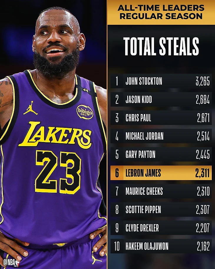 По ходу встречи с «Филадельфией» форвард «Лейкерс» совершил 1 перехват и поднялся на чистое 6-е место, обойдя прославленного игрока НБА Мориса Чикса (2 310).