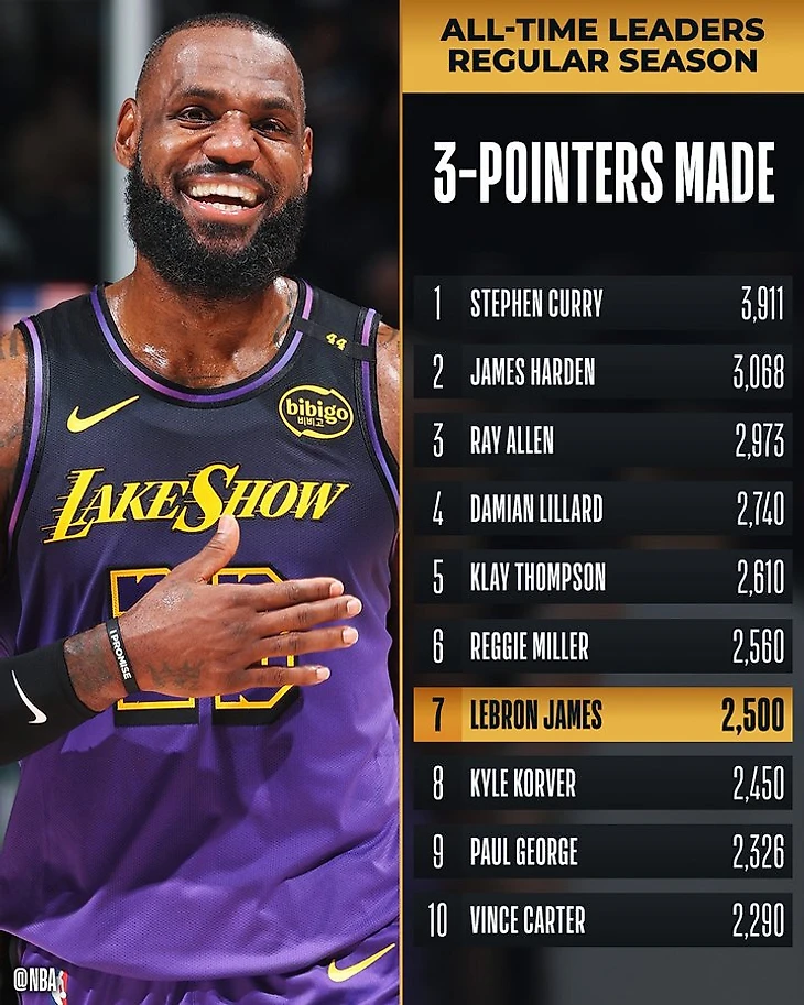 Форвард «Лейкерс» стал 7-м игроком в истории НБА, который реализовал 2500 и более трехочковых бросков в регулярных сезонах.