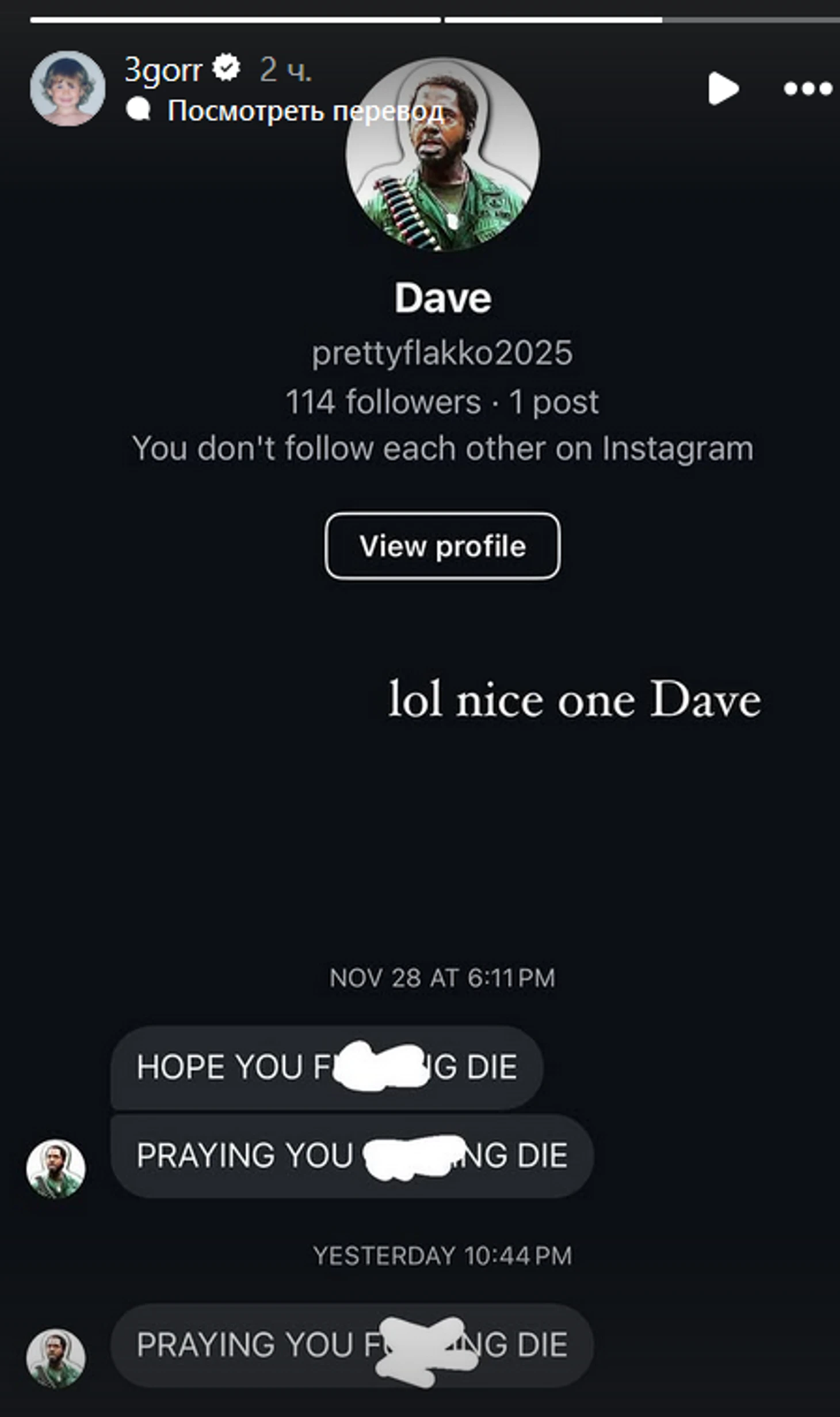 Российский разыгрывающий, выступающий в NCAA за университет Бригама Янга, опубликовал в сториз скриншот трех сообщений с пожеланием смерти от незнакомого пользователя.