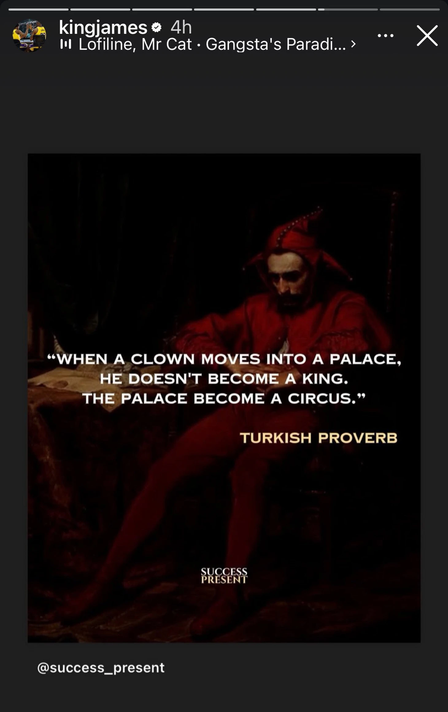 Форвард «Лейкерс» выложил пост в сети инстаграм, в котором говорится: «Когда клоун переезжает во дворец, он не становится королем. Дворец становится цирком».