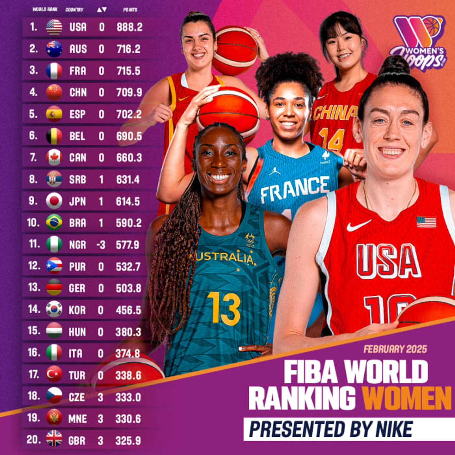 США, Австралия и Франция продолжают лидировать среди женских национальных команд. Франция вплотную приблизилась ко 2-й строчке по очкам. На 3 позиции упала Нигерия.