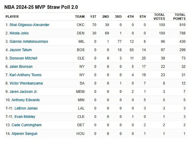 ESPN провел 2-й опрос 100 журналистов и экспертов по поводу награды MVP.