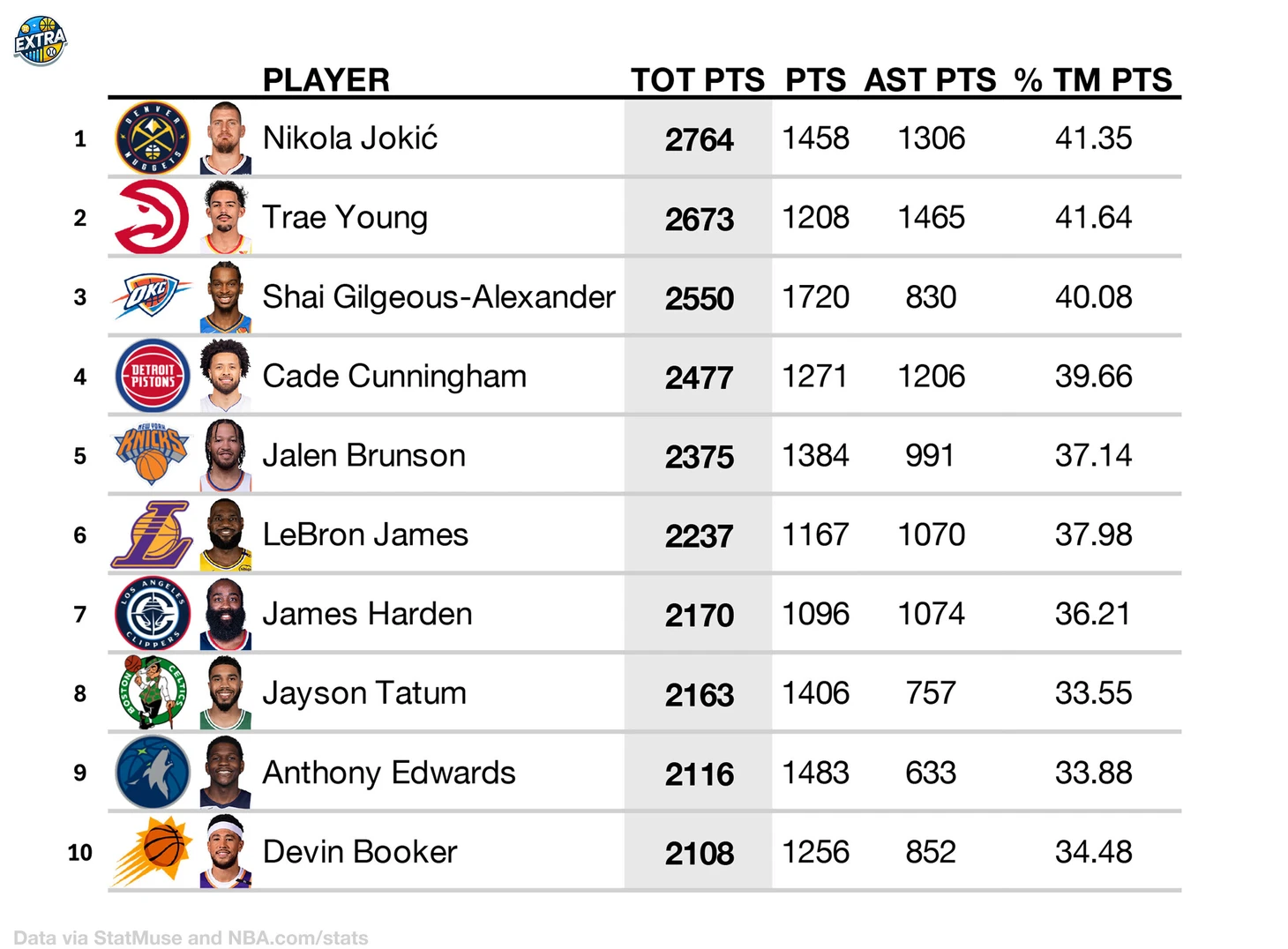 Extra Muse опубликовал десятку лидеров текущего сезона по количеству «принесенных очков» (сумма набранных очков и очков, набранных с передачи игрока).