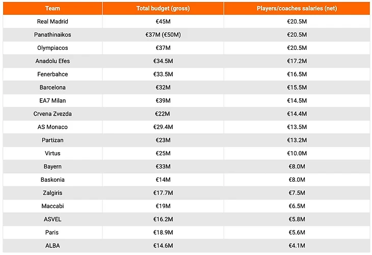 Самыми богатыми клубами Евролиги остаются испанский «Реал» и греческие гранды «Панатинаикос» и «Олимпиакос». Примечательно, что «Реал» лидирует по общему бюджету, но по зарплатам стоит с греческими командами в одном ряду. Далее идут турецкие «Анадолу Эфес» и «Фенербахче».