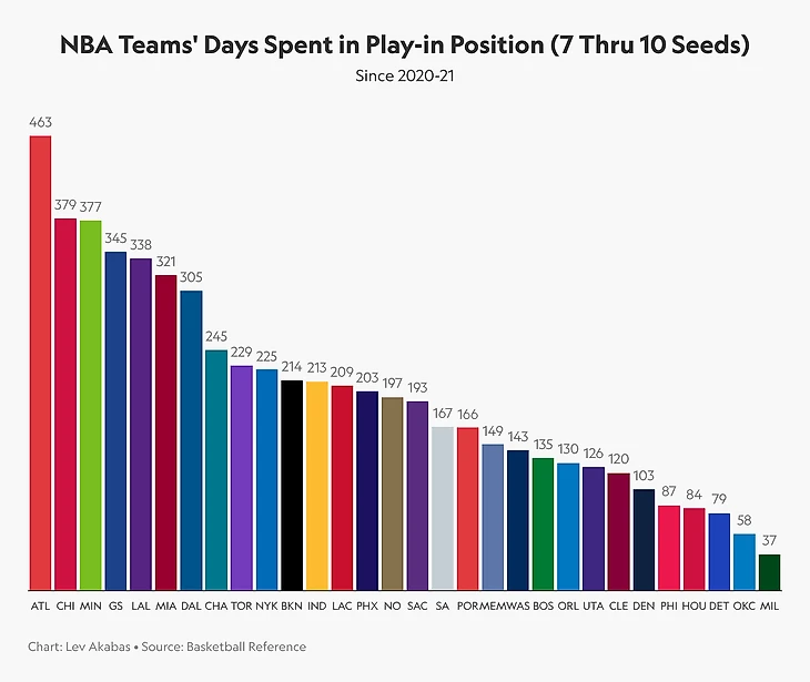 Репортер Лев Акабас опубликовал диаграмму, на которой показано, сколько дней каждая команда НБА провела в зоне плей-ин (7-10 места в конференции) за последние пять сезонов.