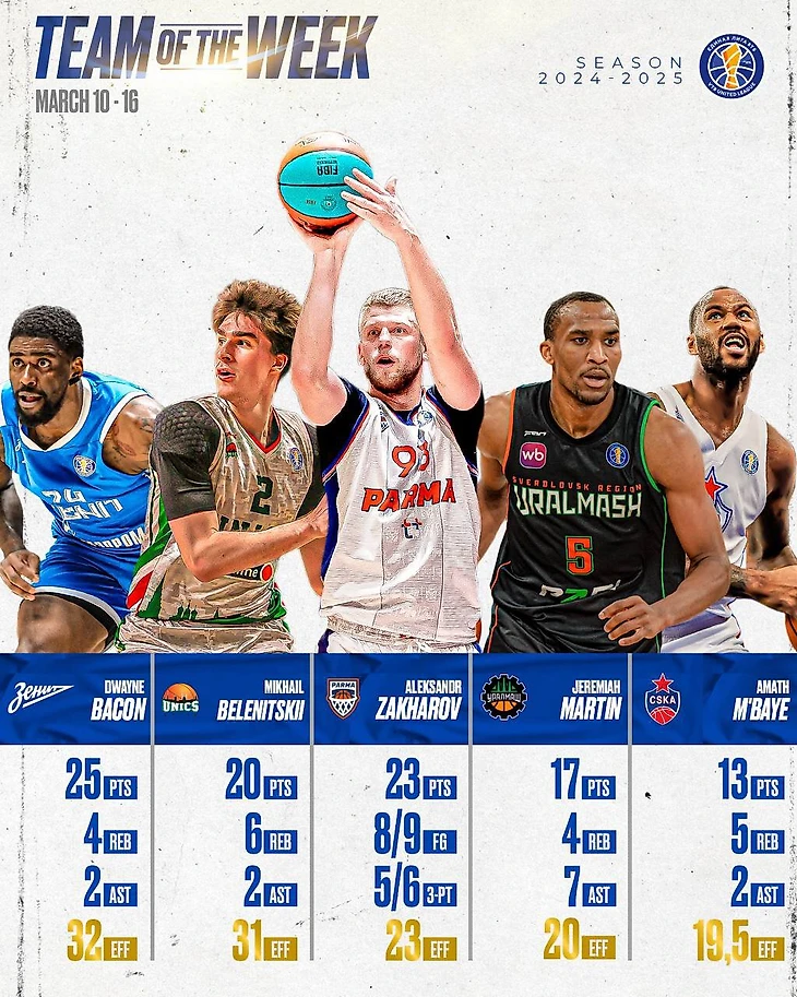 В пятерку лучших игроков по итогам матчей 10-16 марта вошли Дуэйн Бэйкон («Зенит»), Михаил Беленицкий (УНИКС), Александр Захаров («Парма»), Джеремайя Мартин («Уралмаш») и Амат Мбайе (ЦСКА).