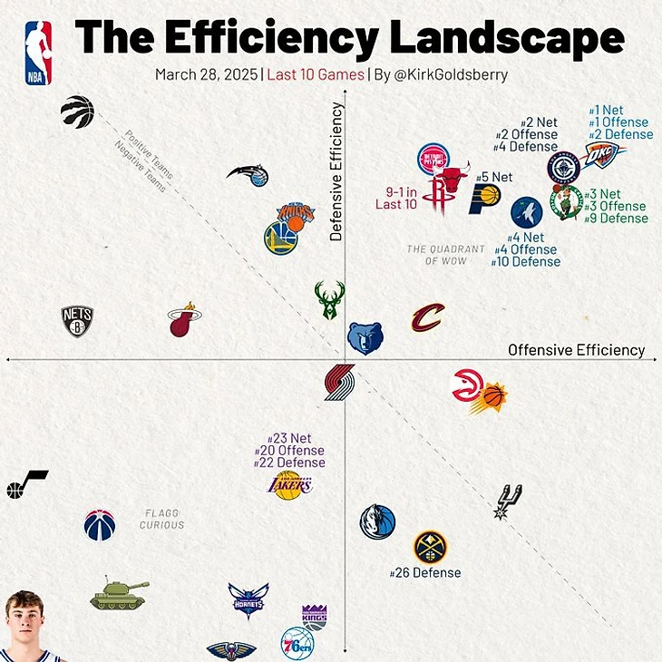 Аналитик Кирк Голдсберри выложил график эффективности клубов НБА.