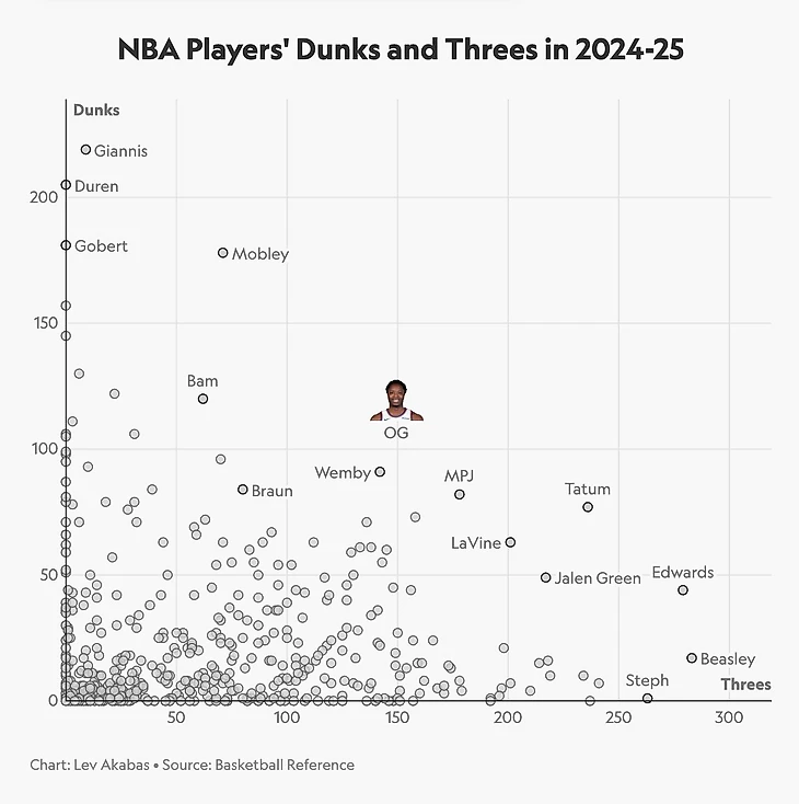Лев Акабас опубликовал график, на котором выделены лидеры нынешнего сезона по количеству данков и трехочковых.