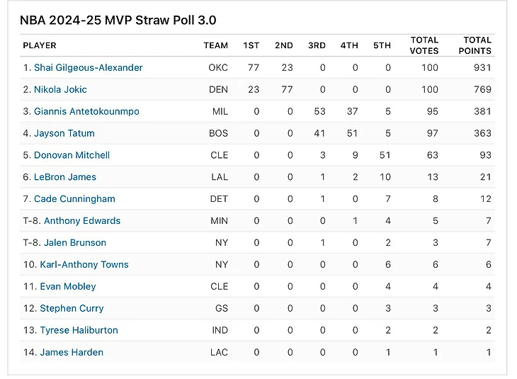 По результатам опроса защитник «Оклахомы» Шэй Гилджес-Александер имеет комфортное преимущество над центровым «Денвера» Николой Йокичем. За шесть недель, которые прошли после второго опроса, фавориты в борьбе за награду MVP почти не изменились.