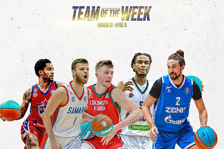 По итогам матчей, прошедших в период с 31 марта по 6 апреля, в нее попали: защитники Мело Тримбл (ЦСКА), Андрей Сопин («Самара»), Калеб Агада («Автодор») и Алексей Швед («Зенит») и центровой Андрей Мартюк («Локомотив-Кубань»).