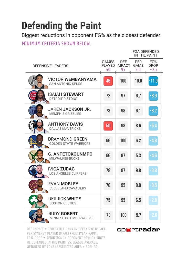 Виктор Вембаньяма больше всех влияет на процент соперника с игры в краске, Айзейя Стюарт и Джарен Джексон – в Топ-3