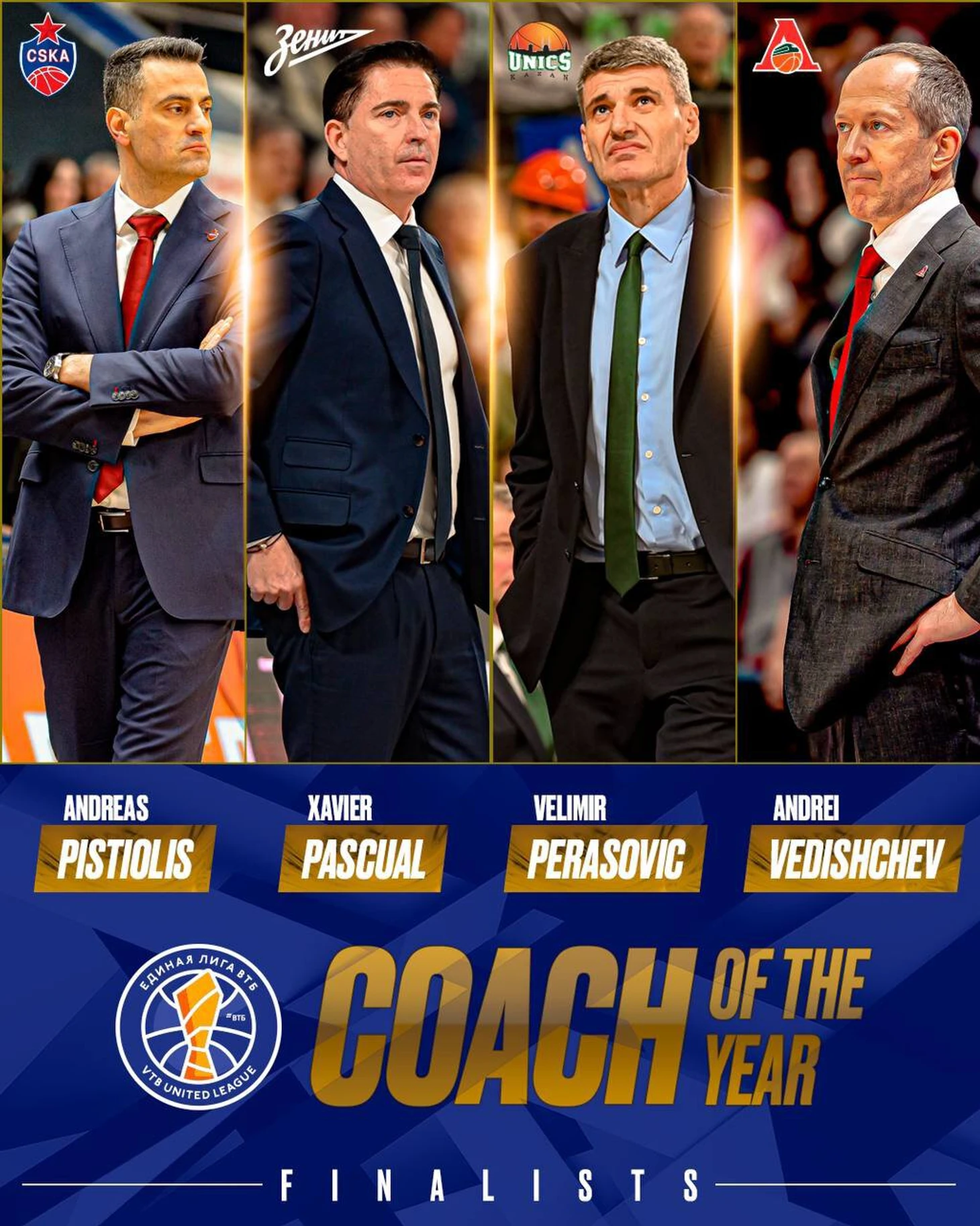 На награду лучшему тренеру сезона-2024/25 претендуют: Хавьер Паскуаль («Зенит»), Андреас Пистиолис (ЦСКА), Велимир Перасович (УНИКС) и Андрей Ведищев («Локомотив-Кубань»).