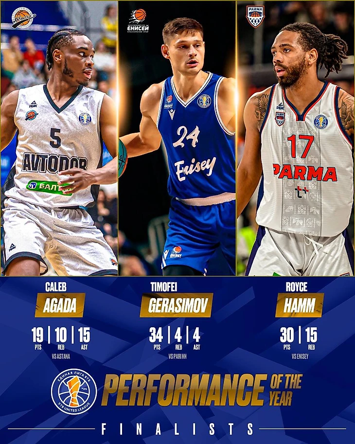 Агада оформил трипл-дабл – 19 очков, 15 передач и 10 подборов в матче против «Астаны». Герасимов набрал 34 очка, 4 подбора и 4 передачи в игре против «Пари НН», Хэмм – 30 очков, 15 подборов и победный 3-очковый во встрече с «Енисеем».