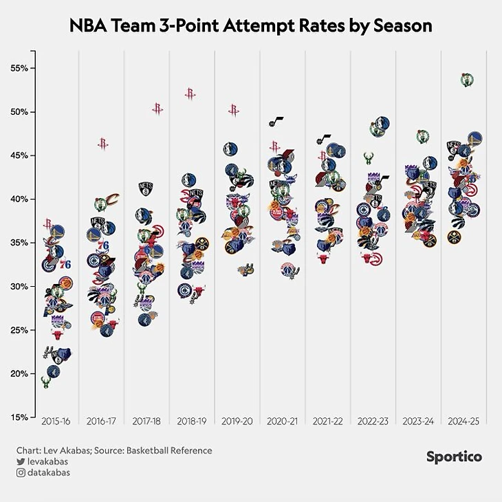Репортер Лев Акабас опубликовал график процента трехочковых бросков команд НБА от общего количества бросков с игры.
