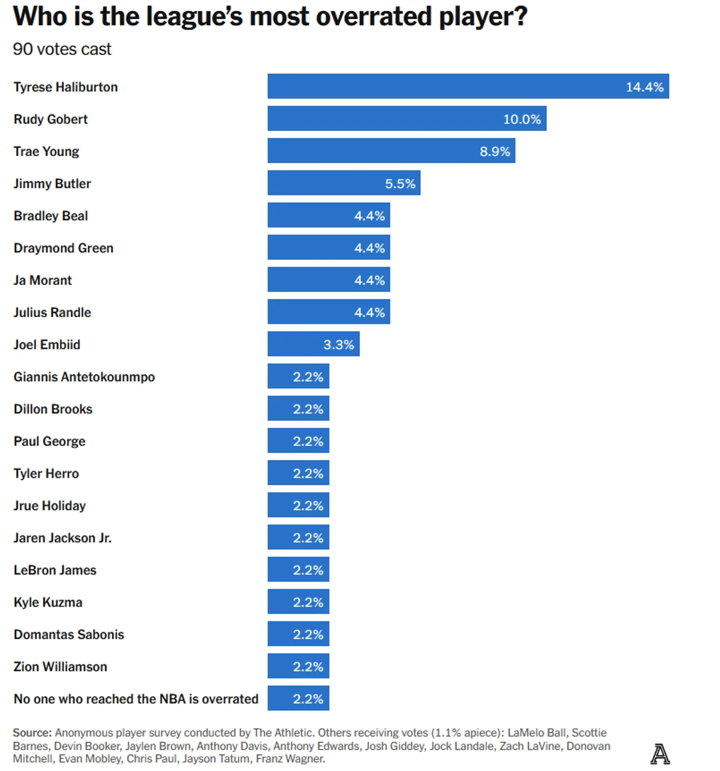 90 игроков НБА поучаствовали в опросе по поводу самого переоцененного игрока .