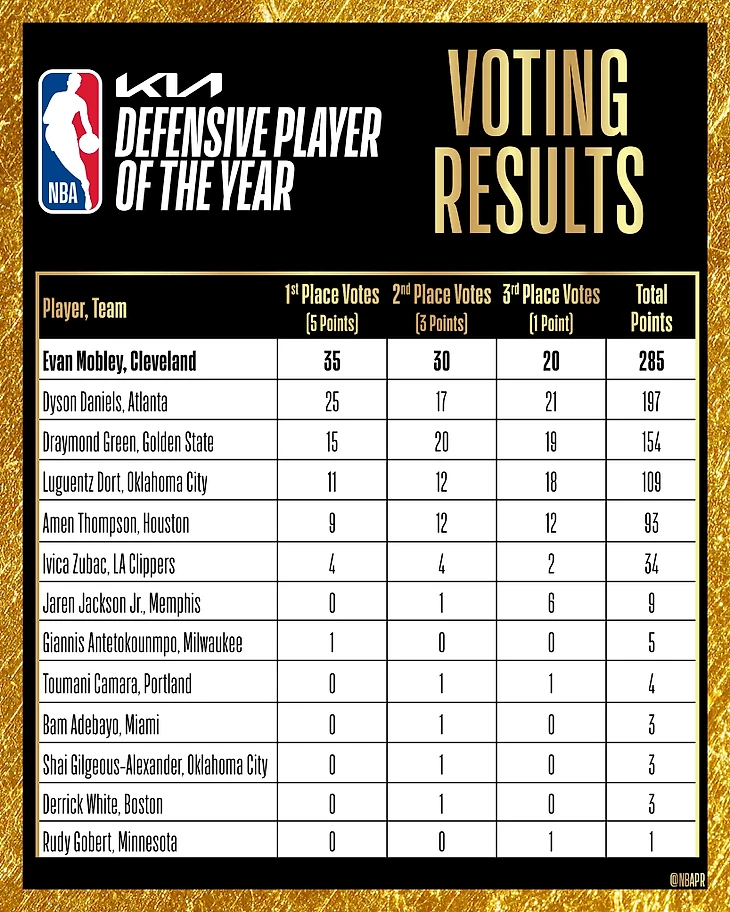 Эван Мобли получил награду «Лучшему защищающемуся игроку» сезона-2024/25