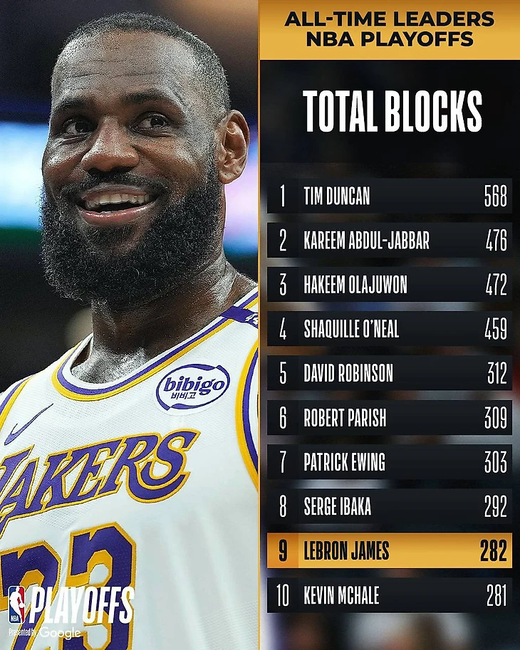 Он смог выйти на 9-е место по блокам в карьере за всю историю плей-офф. Теперь у Джеймса 282 блока, он обогнал легенду «Селтикс» Кевина Макхэйла.