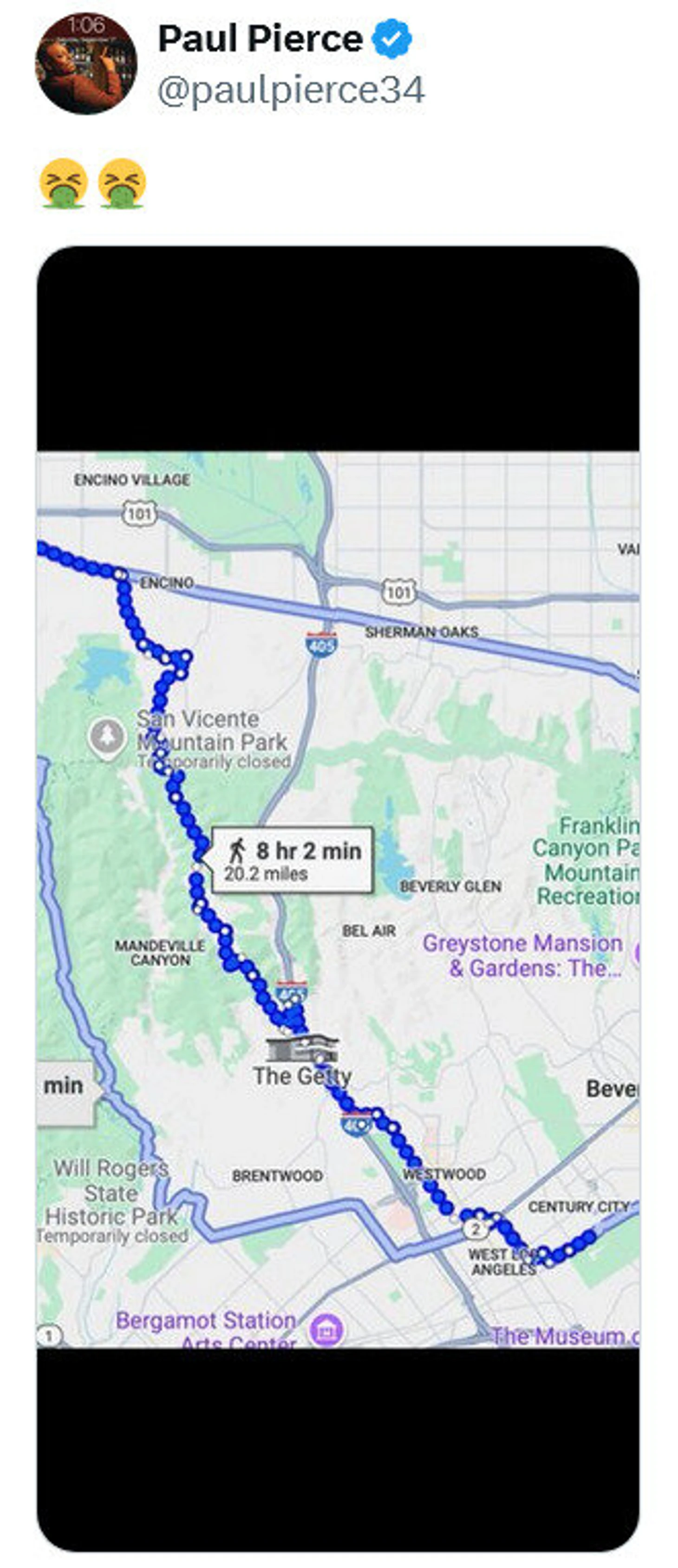 После поражения «Бостона» Пирс опубликовал в соцсети X карту восьмичасового пути, который ему придется совершить.
