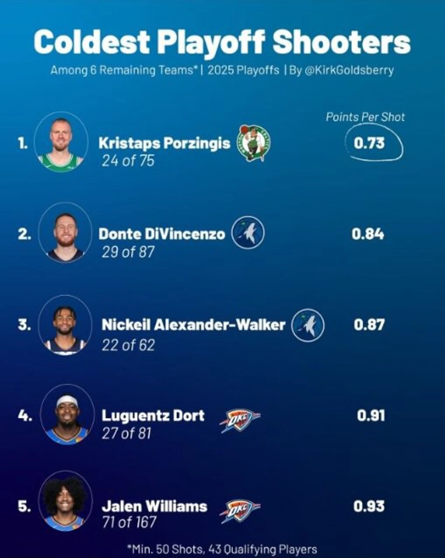 Топ-5 среди баскетболистов, еще не вылетевших из плей-офф, с минимум 50 бросками и самой низкой точностью с игры оказался неожиданным. Выборка произведена из 43 игроков из 6 команд, подпадающих под условия.
