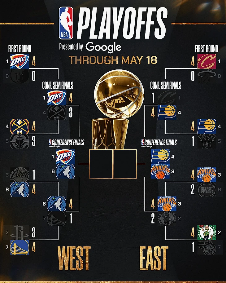 3 из 4 авторов считают, что в финал от Востока выйдет «Индиана», победив «Никс». Также 3 голоса из 4 были отданы за «Оклахому» в серии с «Миннесотой» на Западе.