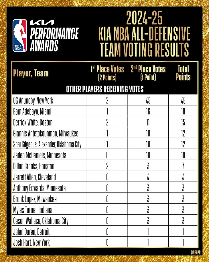 НБА объявила символические пятерки по игре в защите сезона-2024/25.