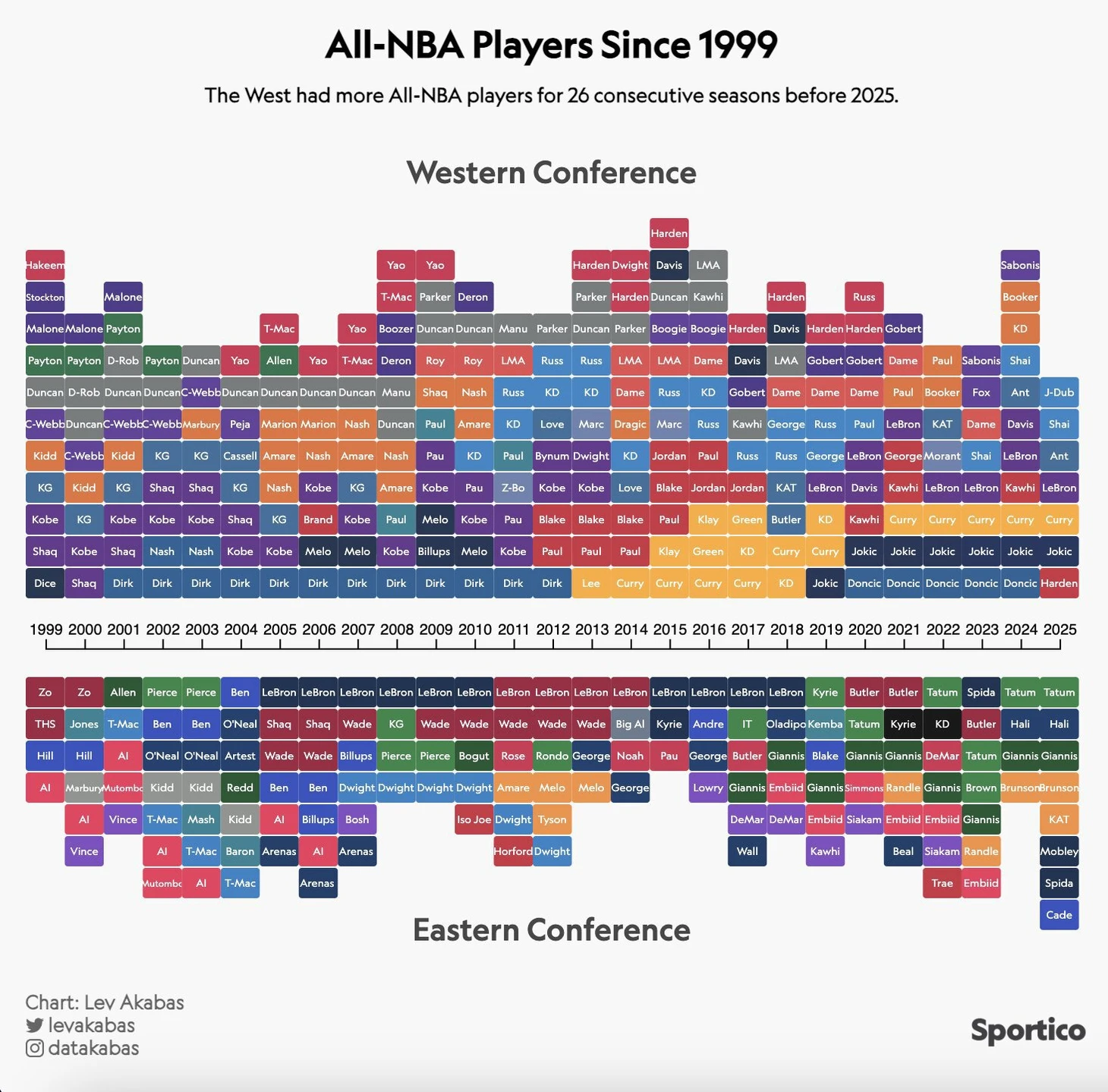 Эксперт Лев Акабас опубликовал инфографику, которая показывает соотношение представителей Западной и Восточной конференций в символических сборных НБА.