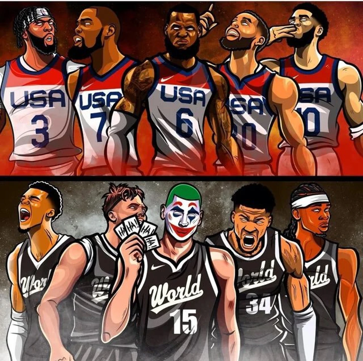 В сборной мира оказались сам Адетокумбо, центровой «Сан-Антонио» Виктор Вембаньяма, центровой «Денвера» Никола Йокич, защитник «Лейкерс» Лука Дончич и защитник «Оклахомы» Шэй Гилджес-Александер.