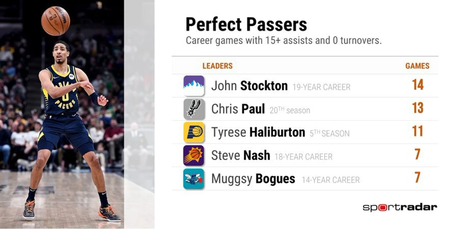 Тайриз Халибертон выдал 11-ю игру в карьере с 15+ передачами и 0 потерь. Это третий результат в истории НБА