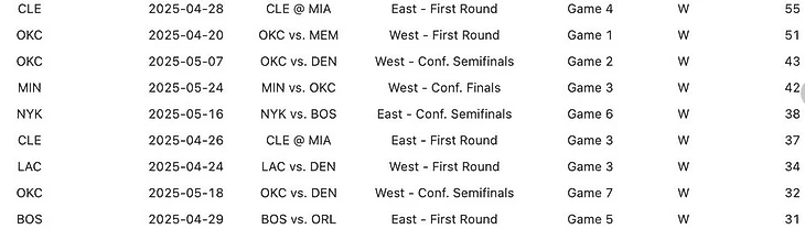 «Оклахома» завершила финал Западной конференции победой над «Миннесотой» с разницей в 30 очков (124:94). Это 4-й матч «Тандер» с подобным (30+) конечным преимуществом в этом розыгрыше плей-офф, что является рекордным показателем для НБА.