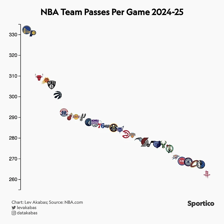 «Пэйсерс» в этом сезоне делают 330 передач в среднем за встречу и занимают второе место в лиге по этому показателю, уступая только «Уорриорз».