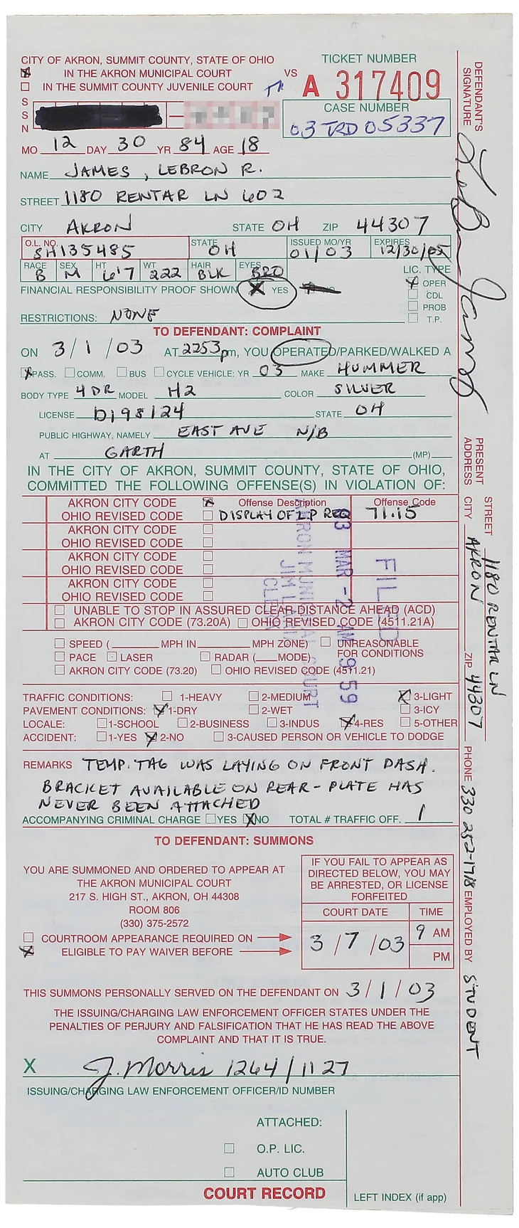 Штрафной бланк, выписанный Леброну Джеймсу за нарушение ПДД, был продан за 8500 долларов