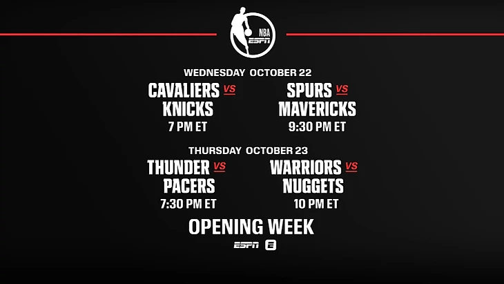 Действующий чемпион «Оклахома», финалист прошлого сезона «Индиана», а также «Нью-Йорк», «Голден Стэйт», «Денвер», «Сан-Антонио», «Кливленд» и «Даллас» появятся в программе недели стартовой недели сезона.