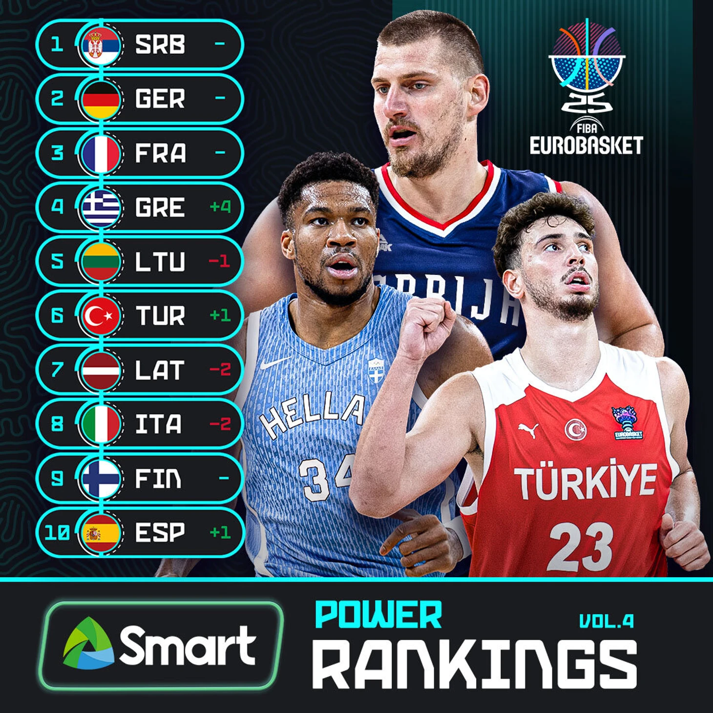 Греция поднялась на 4-е место (+4) в обновленном рейтинге сборных Евробаскета-2025 по версии ФИБА