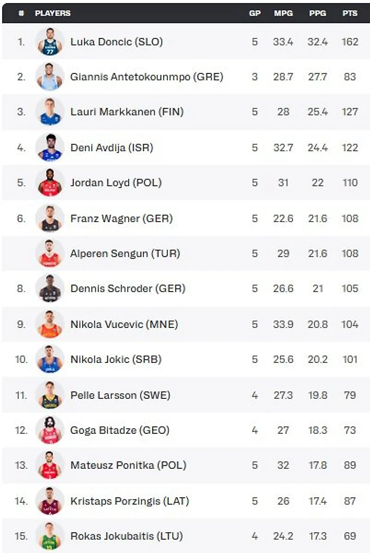 Этот показатель вывел его на 5-ю строчку в списке самых результативных игроков, который возглавляет словенский разыгрывающий Лука Дончич (32,4).