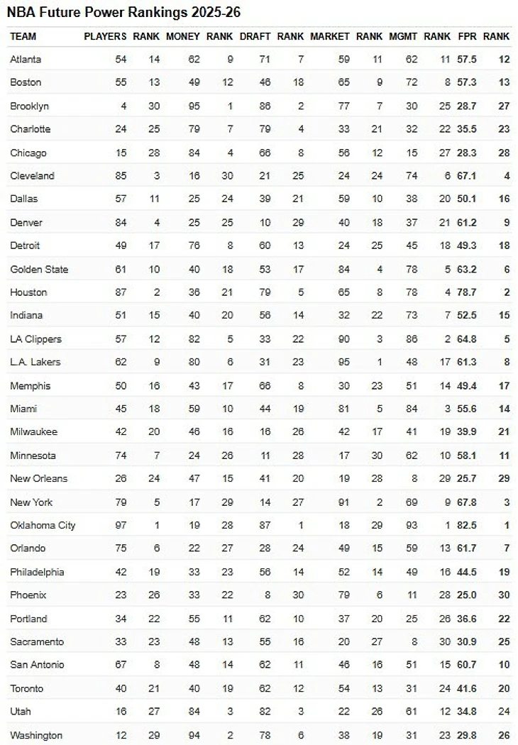 Эксперты телеканала оценили клубы с точки зрения потенциала нынешних составов, фронт-офисов, владельцев, тренеров, бюджетов, платежек, репутации, рынков и активов на драфте и транслировали эти результаты на ближайшие три сезона (до 2028 года).