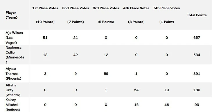 51 из 72 проголосовавших экспертов поставил Уилсон на 1-е место, остальные назвали ее 2-й. Коллиер выбрали 18 человек. Еще 3 эксперта отдали 1-е место форварду Алиссе Томас из «Финикса».