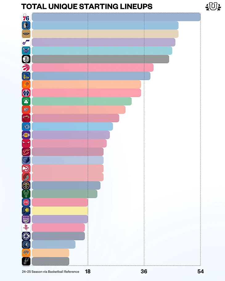 Единоличным лидером стали «Сиксерс», которые опробовали 54 стартовых состава за 82 игры «регулярки».